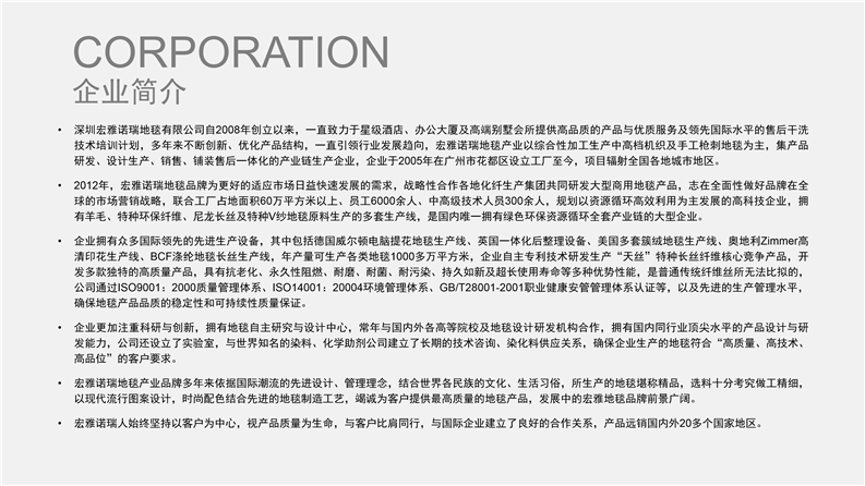 2012年,宏雅諾瑞地毯品牌為更好的適應市場日益快速發展的需求,戰略性合作各地化纖生產集團共同研發大型商用地毯產品,志在全面性做好品牌在全球的市場營銷戰略,聯合工廠占地面積60萬平方米以上、員工6000余人、中高級技術人員300余人,規劃以資源循環高效利用為主發展的高科技企業,擁有羊毛、特種環保纖維、尼龍長絲及特種V紗地毯原料生產的多套生產線,是國內唯一擁有綠色環保資源循環全套產業鏈的大型企業。